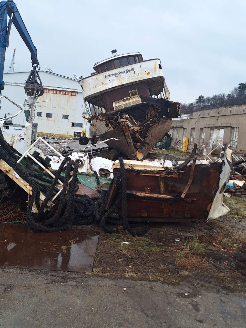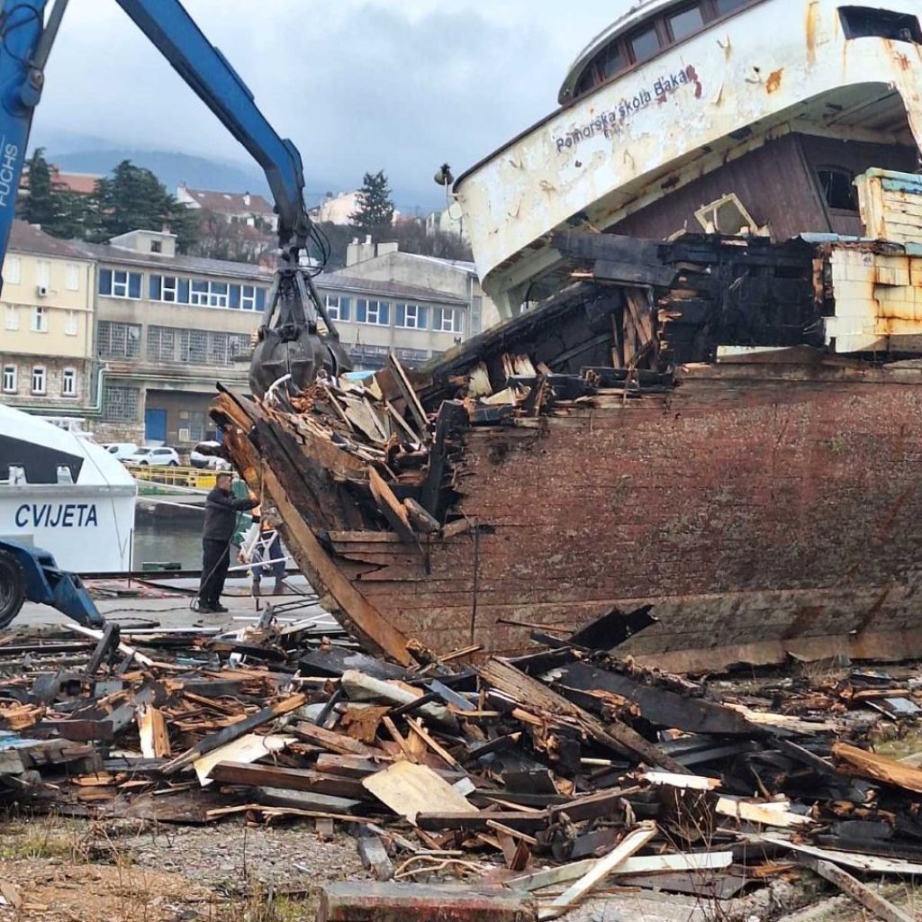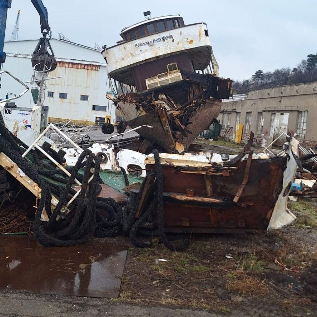 KRALJEVICA Školski brod Vila Velebita II stigao je do svog konačnog kraja. Brod je već u komadima, moglo bi se reći da broda koji je u Pomorskoj školi Bakar 52 godine služio budućim pomorcima više nema. Podsjetimo da je dotrajali brod lanjskog srpnja otegljen iz Bakra u Kraljevicu. Brod se potom bezuspješno pokušavao prodati. Lanjskog listopada brod je nakon ekstremnih kiša potonuo i to je bila najava kraja. U prosincu je brod izvučen na površinu, a sada je krenulo rezanje broda.