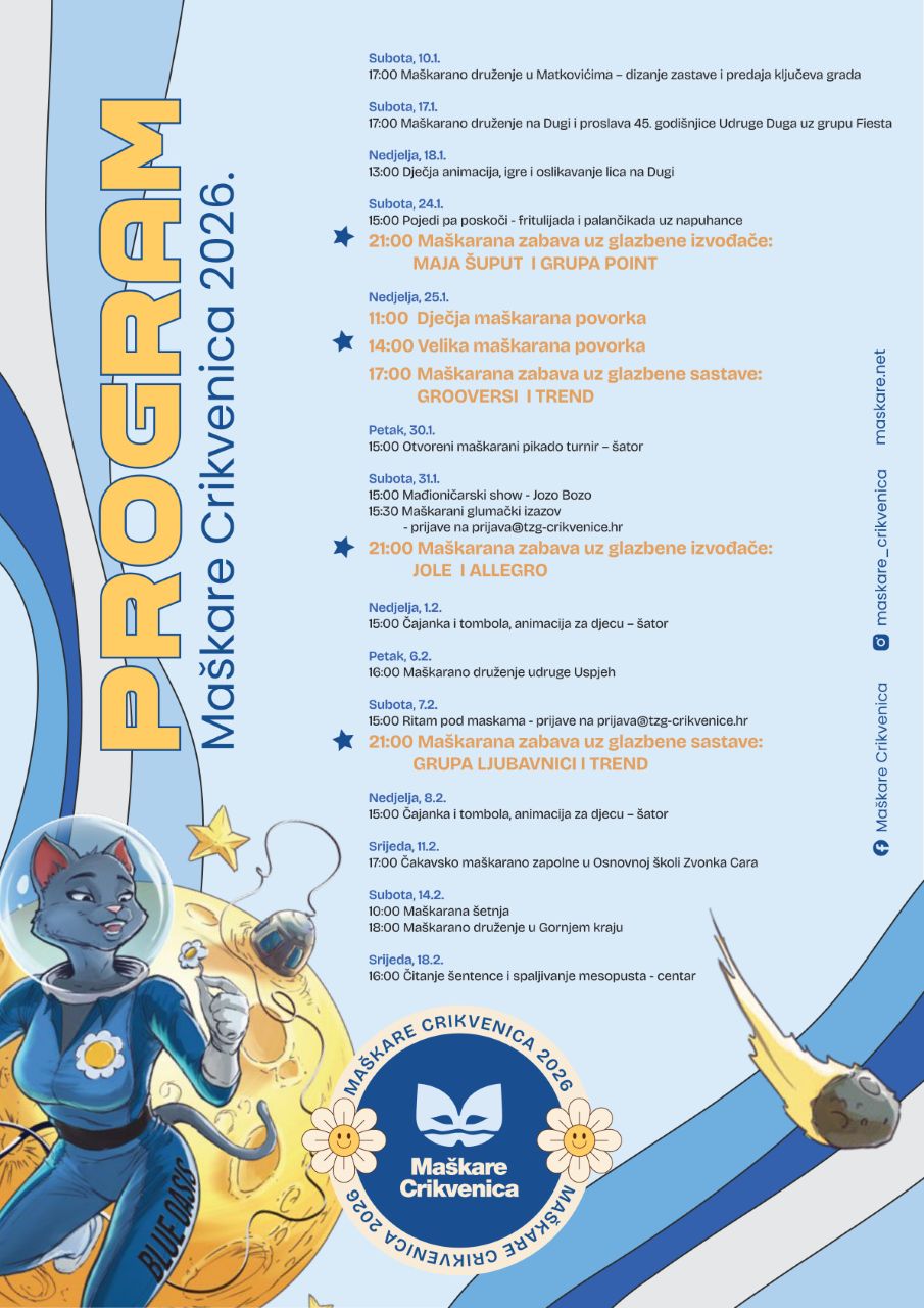 CRIKVENICA Drugi maškarani vikend u Crikvenici donosi novo maškarano okupljanje. U subotu maškarano druženje na Dugi počinje u 17 sati. Povod je proslava 45. obljetnice Udruge za narodne običaje Duga. Slavljenike i prijatelje koji stižu čestitati od 21 sat će zabavljati sastav Fiesta.