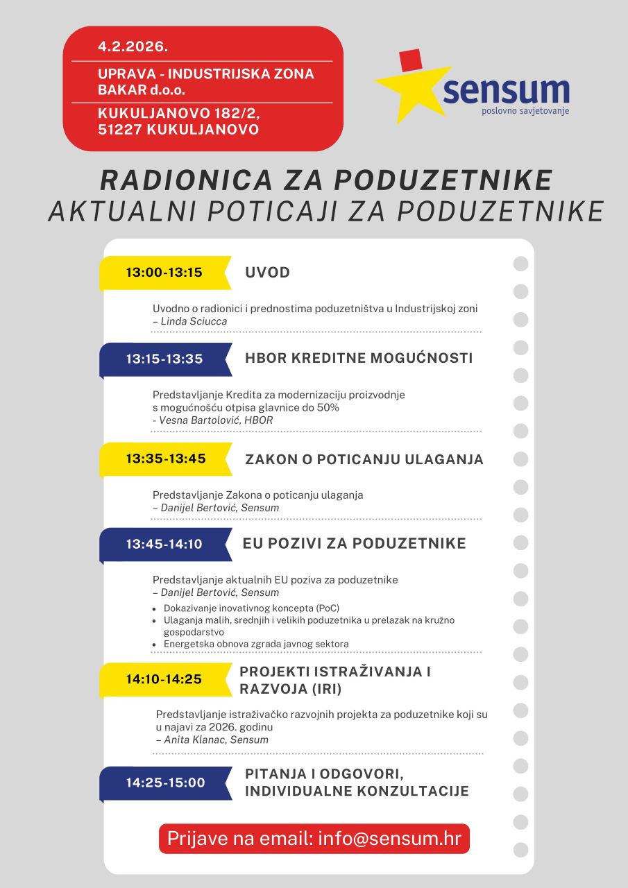 Radionica je namijenjena malim, srednjim i velikim poduzetnicima koji žele dobiti ažurne informacije o dostupnim financijskim instrumentima, zakonodavnom okviru te EU i nacionalnim poticajima za ulaganja. Sudionici će imati priliku upoznati se s prednostima poslovanja u Industrijskoj zoni Bakar, kao i s konkretnim mogućnostima financiranja i razvoja poslovanja u 2026. godini.