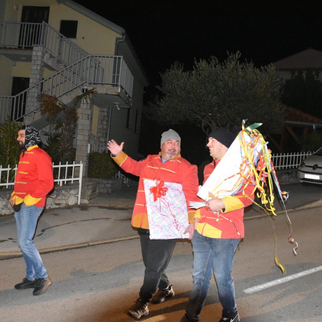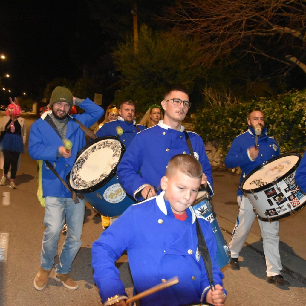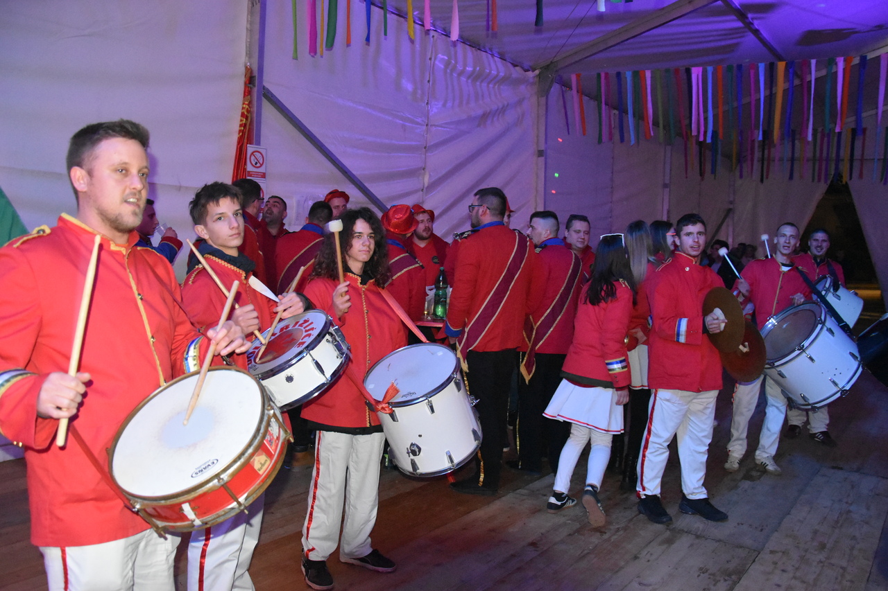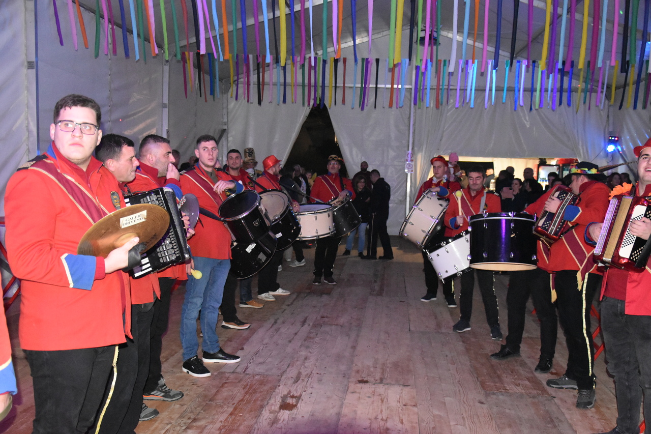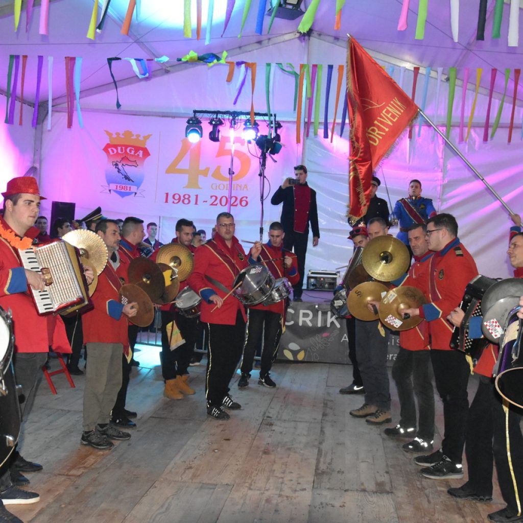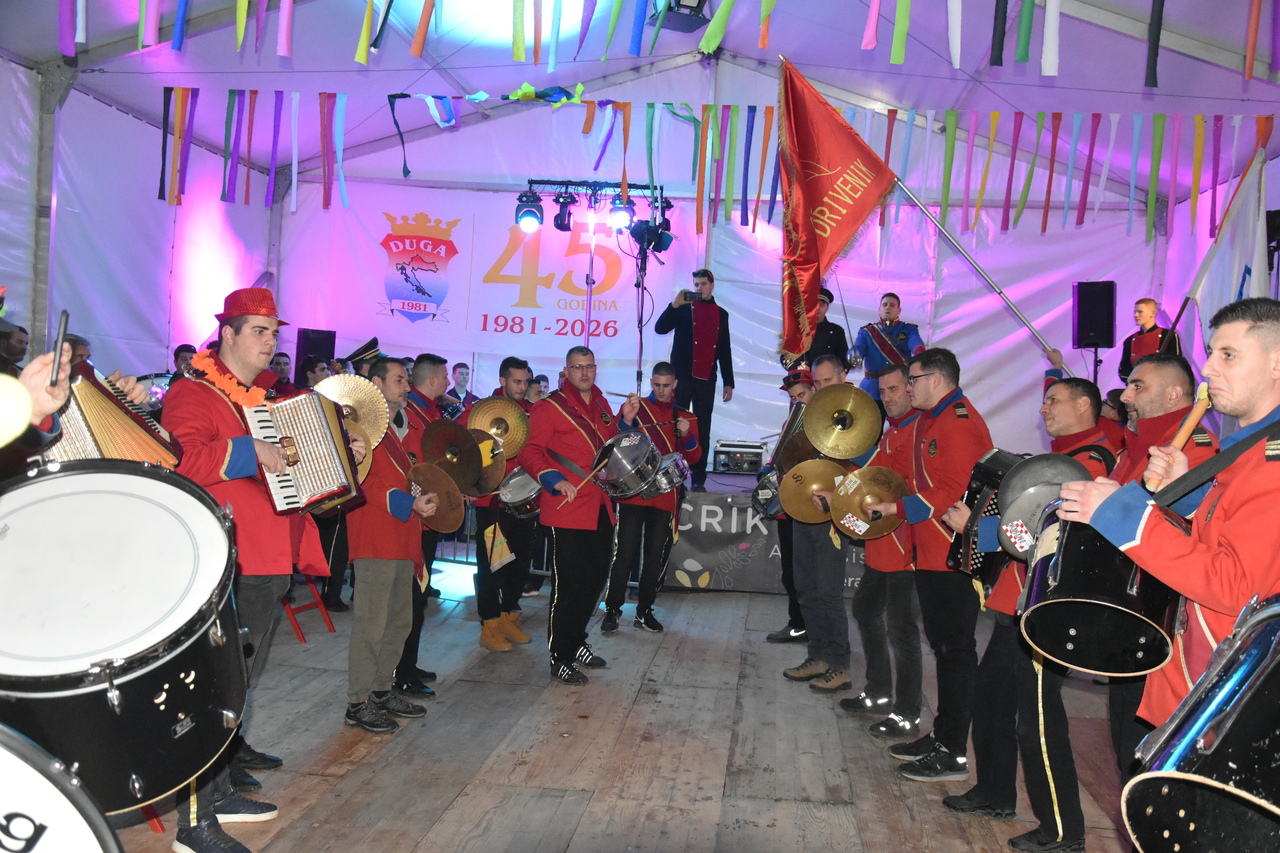 CRIKVENICA Maškare, mačkare, maškaroni, mesopustari, parade, krabulje iz Hrvatskog primorja, od Hreljina do Ledenica, došle su na Dugu uljepšati i čestitati 45. rođendan udruzi Duga. Grupa za grupom ulazila je u šator, pjesmom, bubnjevima i muzikom poželjela još toliko lijepih godina. U šatoru sve generacije Duge koja je na svoje maškarano putovanje spontano krenula 1981. godine. Veterani s Duge, crikveničkog naselja u kojem živi oko tisuću i pol stanovnika, tada nisu niti sanjali da će njihovo okupljanje prerasti u nešto što živi s Dugom i strašću prema maškarama 45 godina. Dio povijesti postat će i maškarani šator koji je prvi put podignut na Dugi. Kako je izgledala povijest Duge pročitajte u tekstu Parada Duga slavi 45. rođendan: krenulo je spontano, traperice i bijele košulje, a bubnjeve su “glumile” limenke.