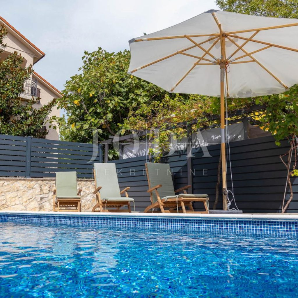 U centralnom dijelu dvorišta je smješten grijani bazen, dok je sa prednje strane velika sjenica sa roštiljem i prostorom za druženje.