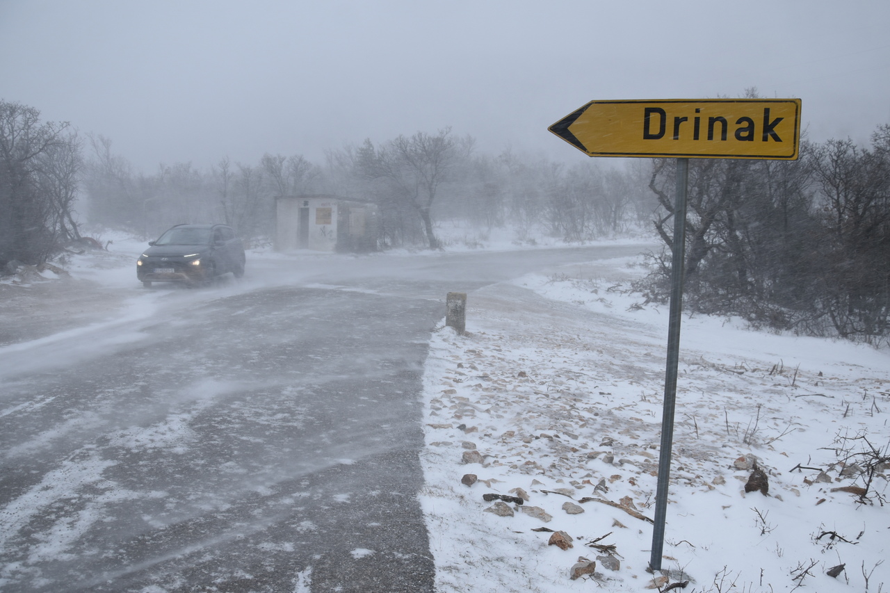 Situacija je kompliciranija na cesti Klenovica – Alan. Krenuli smo oko podneva prema Alanu, no već iznad Krmpota Polja bura ledi cestu. Bilo je najpametnije okrenuti se kod skretanja za Drinak. Situacija se u međuvremenu samo pogoršala.– Gore najviše puše, vjerojatno ćemo proći ralicom, ali preporuka je ne ići, apelira Miletić.