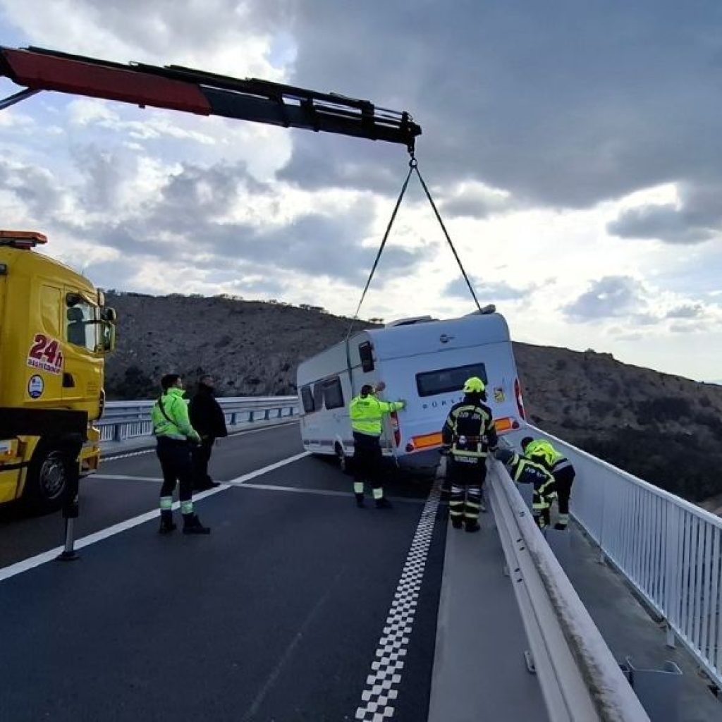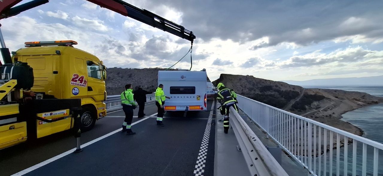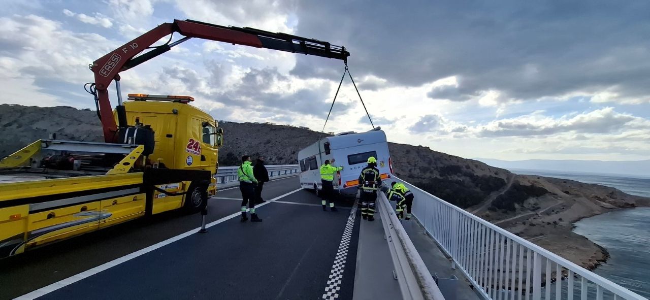 Kraljevica  Vatrogasci i vučna služba spašavali prikolicu s Krčkog mosta po buri od 150 na sat